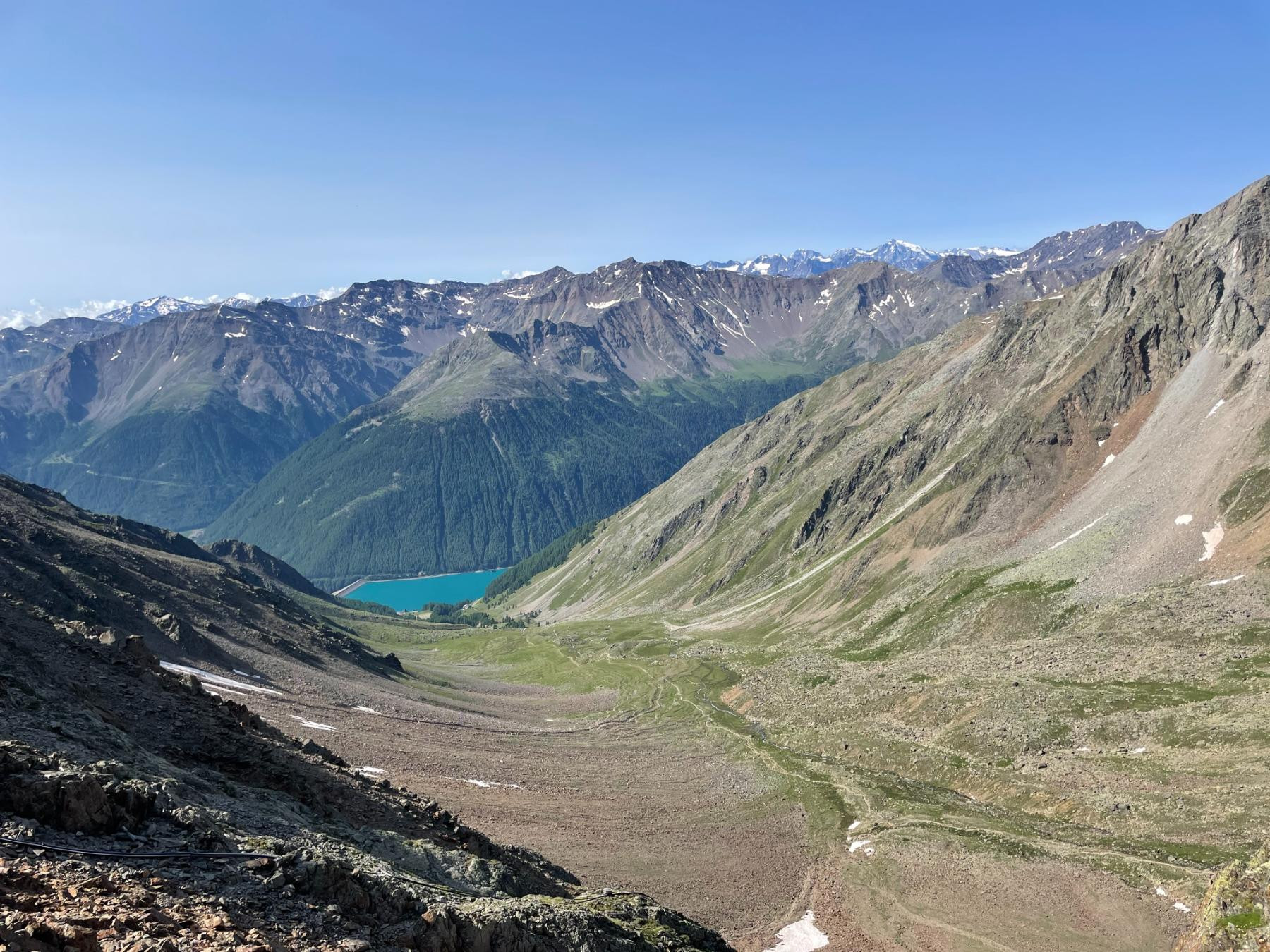 <Heute überqueren wir den Alpenhauptkamm und wandern von der hochalpinen Region der Ötztaler Alpen hinunter nach Südtirol. Von der Martin-Busch-Hütte steigen wir durchs Niedertal zur von Gletschern umgebenen Similaunhütte auf. Mit stolzen 3.019 Metern Höhe erreichen wir hier den höchsten Punkt unserer Alpenüberquerung. Bei einer kurzen Rast können wir den Ausblick auf den eisbedeckten Gipfel des Similaun (3.599 m) genießen. Von der Hütte führt die Route steil abwärts ins Tisental. Unten funkelt bereits der Vernagtsee in strahlendem Blau – das Ziel unserer heutigen Etappe. Die letzten Kilometer in Richtung Meran legen wir per Taxi zurück. Unter Palmen können wir dann am Pool unserer Unterkunft die Tour ausklingen lassen oder auch die Zeit nutzen, um noch ein bisschen die Altstadt von Meran zu erkunden. Verpflegung: Frühstück, Abendessen -