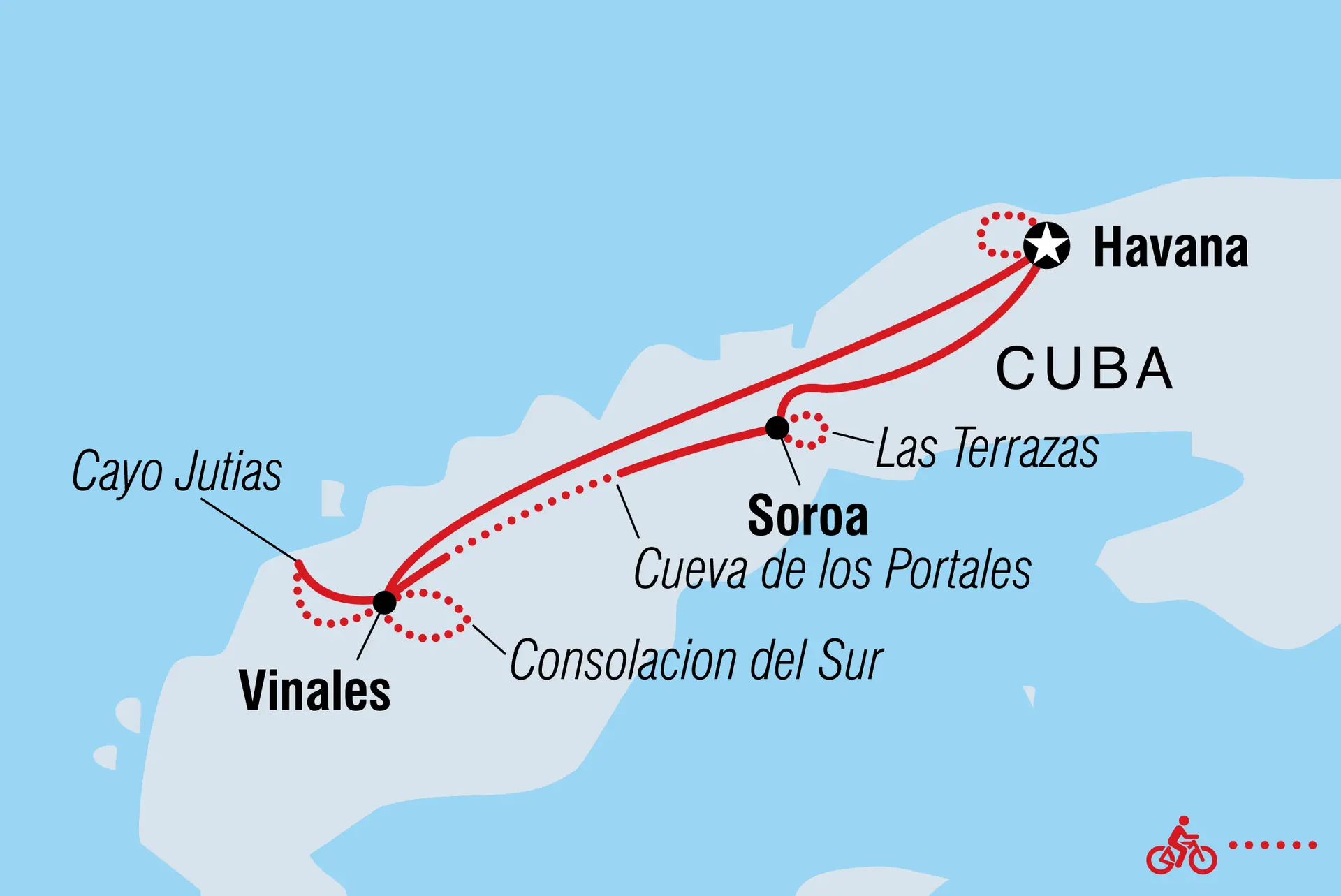 Erkunden Sie Kubas ländliche Straßen mit dem Fahrrad zu einem weißen Sandstrand, einer Tabakplantage und einem Kalksteinparadies. Möchten Sie wissen, wie es sich anfühlt, neben Traktoren und Oldtimern vorbeizufahren, an Tabakfarmen und üppigen Kalksteinlandschaften? Spüren Sie den karibischen Wind in Ihren (helmbedeckten) Haaren auf dieser siebentägigen Radreise durch Kuba. Entdecken Sie die reiche Geschichte und die zerfallenden Ruinen von Alt-Havanna, während Sie durch die farbenfrohen Straßen der Hauptstadt radeln. Radeln Sie zu den unberührten Stränden von Cayo Jutias, um sich von der Hitze abzukühlen, und lassen Sie einen erlebnisreichen Tag im Sattel in Viñales mit einem Festmahl aus regionalen Produkten (inklusive kostenlosem Rum!) ausklingen. Von den artenreichen Tälern von Soroa bis hin zu den herzlichen Armen der bekannten Bäuerin Mama Luisa – verlassen Sie die ausgetretenen Pfade und entdecken Sie einzigartige Orte der Insel, die Sie nur mit dem Fahrrad erreichen können. - 1. Es ist sehr wichtig, dass Sie Ihre Körpergröße bei der Buchung angeben, damit wir Ihnen zu Beginn Ihrer Reise ein Fahrrad in der passenden Größe bereitstellen können. Sollten Sie uns Ihre Körpergröße nicht vor Ihrer Ankunft mitteilen, können wir Ihnen kein passendes Fahrrad garantieren. 2. Ein kostenloser Flughafentransfer ist inklusive. Dieser gilt, wenn Sie am ersten Tag anreisen oder eine Vorübernachtung über uns gebucht haben. Bitte teilen Sie Ihrem Reisebüro Ihre Flugdaten mindestens 14 Tage vor Reiseantritt mit. 3. Gegen einen Einzelzimmerzuschlag können Sie ein Zimmer buchen, falls Sie auf dieser Reise kein Zimmer teilen möchten. Der Einzelzimmerzuschlag gilt für alle Übernachtungen und ist abhängig von der Verfügbarkeit. Bitte wenden Sie sich für weitere Informationen an Ihr Reisebüro. 4. Die Fahrradmiete ist im Reisepreis enthalten. Bitte teilen Sie uns Ihre Körpergröße bei der Buchung mit, damit wir ein passendes Fahrrad organisieren können. E-Bikes sind normalerweise auf Anfrage verfügbar. Aufgrund von Stromausfällen, die das Aufladen beeinträchtigen, können wir Ihnen derzeit jedoch keine E-Bikes zur Verfügung stellen. 5. Das Tragen eines Fahrradhelms ist auf dieser Reise Pflicht. Es ist nicht möglich, vor Ort Fahrradhelme zu kaufen oder auszuleihen. Bitte bringen Sie daher unbedingt Ihren eigenen Fahrradhelm von zu Hause mit. 6. Für alle Reisenden, die nach Kuba einreisen, ist eine Reiseversicherung obligatorisch. Sie können bei Ihrer Ankunft am Flughafen Havanna von den Einreisebeamten aufgefordert werden, einen Nachweis über Ihre Reiseversicherung vorzulegen.