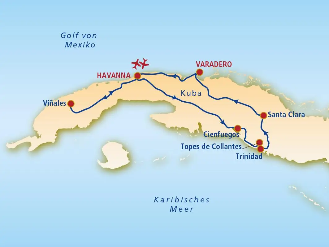 Kuba Rundreise – Von Havanna bis Varadero: 15 Tage Karibik pur Erleben Sie Kuba von seiner schönsten Seite: Von Havanna bis Varadero entdecken Sie auf dieser 15-tägigen Rundreise die ganze Vielfalt der Karibikinsel. Schlendern Sie durch die kolonialen Altstadtgassen Havannas, genießen Sie das grüne Viñales-Tal mit seinen Tabakfeldern und lassen Sie Ihre Reise an den traumhaften Stränden von Varadero ausklingen. Diese Kuba-Rundreise verbindet Kultur, Natur und Erholung in idealer Weise. Freuen Sie sich auf sorgfältig ausgewählte Ausflüge, eine erfahrene deutschsprachige Reiseleitung und komfortable Unterkünfte – perfekt für Reisende, die das echte Kuba intensiv erleben möchten. Reisehöhepunkte Koloniales Flair in Havanna – Oldtimer, Musik und Geschichte Naturparadies Viñales-Tal – grüne Täler, Tabakfarmen und Kalkfelsen Traumhafte Badeerlebnisse in Varadero Authentische Begegnungen mit Land und Leuten Rundum-Service mit Organisation, Transfers und Reiseleitung Ihr karibisches Abenteuer Diese Kuba Rundreise mit Badeverlängerung bietet Ihnen unvergessliche Eindrücke von einer Insel zwischen Tradition und Lebensfreude. Erkunden Sie Kubas kulturelle Schätze, genießen Sie die tropische Landschaft und entspannen Sie zum Abschluss am türkisblauen Meer. Erleben Sie Kuba authentisch, abwechslungsreich und unvergesslich – von Havanna bis Varadero.