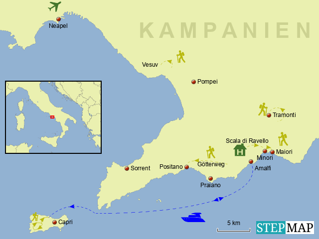 <Die Wanderungen sind teils anspruchsvoll, es handelt sich um schmale Wege, oft verbunden mit steilen An- und Abstiegen, häufig über Treppen, mitunter über Felsen. Geeignete Wanderschuhe sind vonnöten, genauso wie Trittsicherheit und Fitness. Weiterhin empfehlen wir geeignete Kleidung, einen Wanderrucksack, eine Kopfbedeckung sowie Sonnen- und Regenschutz. Jeder Teilnehmer sorgt selbst für ausreichend Trinkwasser auf den Wanderungen (Empfehlung 1,5 l pro Person/Tag), auch ein kleiner kohlenhydratreicher Snack für unterwegs sollte immer im Rucksack sein. GEHZEIT: Bei den nach jeder Tagesetappe angegebenen Gehzeiten handelt es sich um durchschnittliche Wanderzeiten, Pausen nicht inbegriffen. Natürlich können die Zeiten variieren, sie hängen von der Gruppengrösse, der allgemeinen Fitness sowie anderen Faktoren wie zum Beispiel den atmosphärischen Bedingungen ab. Gern beraten wir Dich auch persönlich per e-mail oder telefonisch, wenn Du Fragen zu den Anforderungen und der Wanderwege hast. ANREISE: Unsere Reisen beginnen am ersten Tag gg. 16.30 Uhr und enden am letzten Tag gg. 10 Uhr am Flughafen Neapel mit unserem Sammeltransfer oder andernfalls direkt am Hotel in Scala. Gern stehen wir bei der Organisation der An- und Abreise zur Seite und helfen, hierfür die ideale Lösung zu finden.