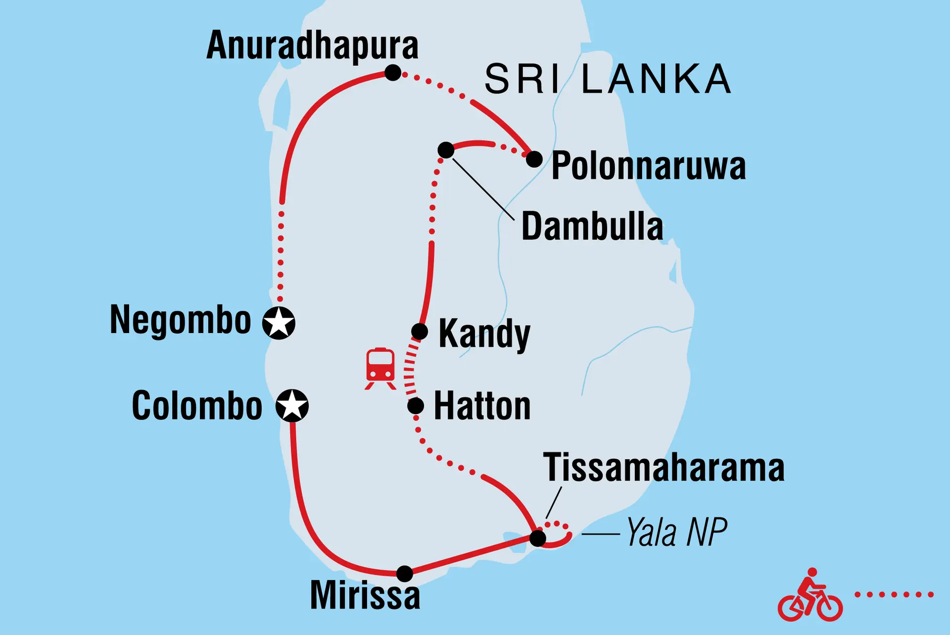 Geführt von einem lokalen Experten führt Sie diese 14-tägige Radreise durch Sri Lanka zu Teeplantagen, Fischerdörfern, Nationalparks, Städten und üppigen grünen Dschungeln. Von Negombo bis Colombo erleben Sie, warum Sri Lanka zu Asiens spannendsten neuen Reisezielen zählt. Mit unberührter Küste, antiken Ruinen, schroffen Gipfeln und wildreichen Nationalparks ist die Insel ein Traum für aktive Reisende. Zwischen den Radtouren erwarten Sie Safari-Abenteuer auf Leoparden-Suche, optionale Food-Touren, entspannte Strandtage an der Südküste, unvergessliche Zugfahrten durch das Hochland, Erkundungen bedeutender hinduistischer und buddhistischer Tempel sowie das berühmte UNESCO-Weltkulturerbe Sigiriya. Mit Tagen voller Aktivität und Abenden voller Genuss erobert Sri Lanka garantiert Ihr Herz.