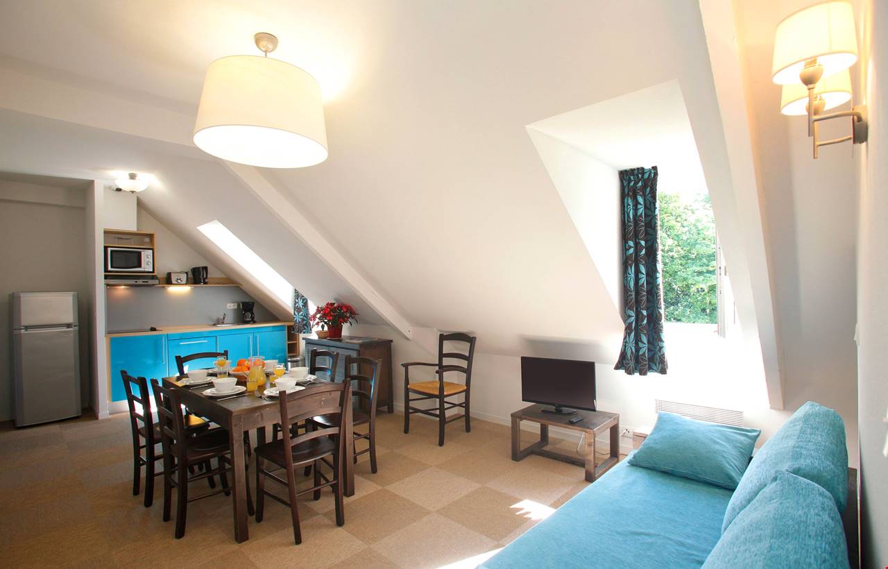 <Im Erdgeschoss mit Terrasse oder im Obergeschoss (Treppe oder Aufzug je nach Lage im Schloss), Wohnzimmer mit ausziehbarem Sofa. 1 Zimmer mit 1 Doppelbett. Ausgestattete Küchenzeile (Ceranfeld 4 Flammen, Mikrowelle / Grill, Geschirrspüler, Kaffeemaschine, Wasserkocher, Toaster, Kühlschrank mit Gefrierfach), Duschraum mit WC oder separates WC. -