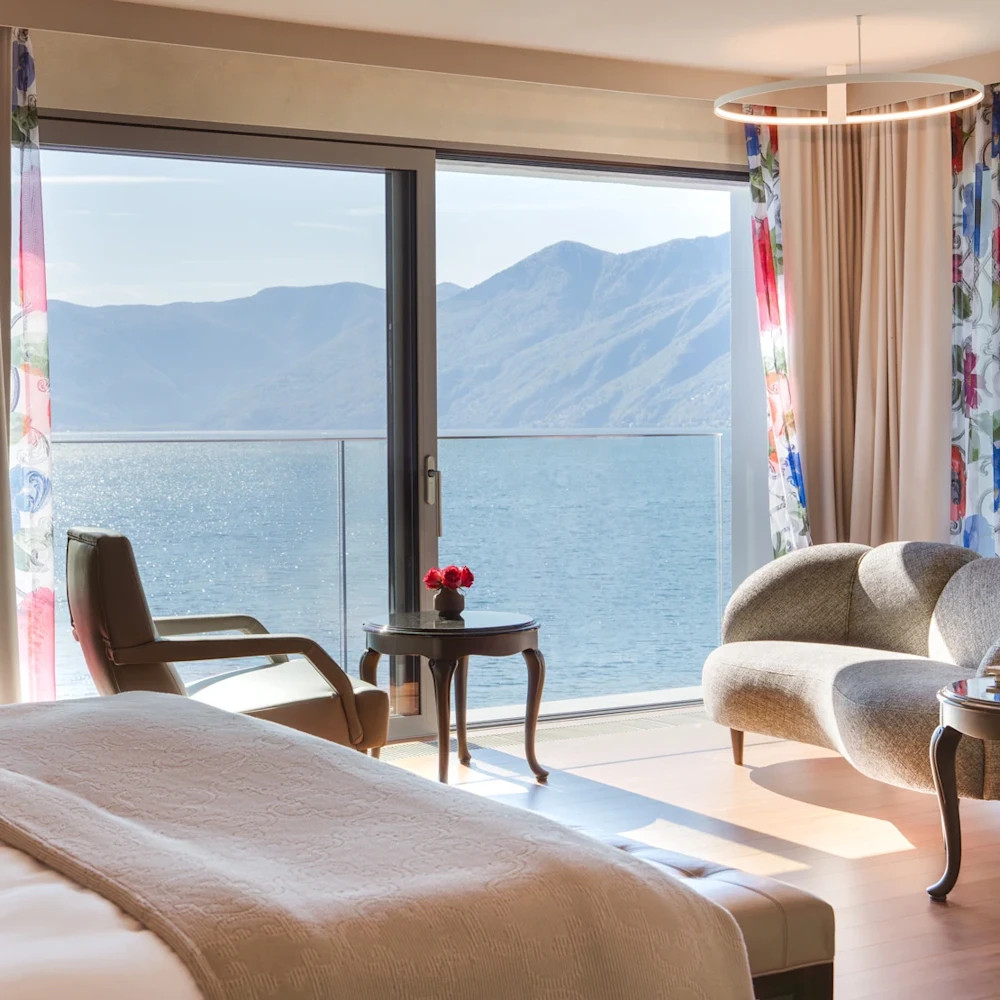 Panorama Doppelzimmer - Seesicht - 40 qm . - Geräumiges und lichtdurchflutetes Panorama Doppelzimmer zur Südseite mit Parkettboden und direktem Blick auf den majestätischen Lago Maggiore. 3 Nächte in einer der von Carlo Rampazzi gestalteten Junior Suiten oder Suiten. Tägliches Eden Roc Frühstück. Resort-Guthaben von 100 CHF pro Suite und Aufenthalt, inkl. Resort Dine Around. zzgl. Kurtaxe CHF 4.50 pro Person/Tag. Zimmerpreis für 2 Personen gesamt für 3 Übernachtungen. - 6. April bis 15. Mai und 1. September bis 25. Oktober
